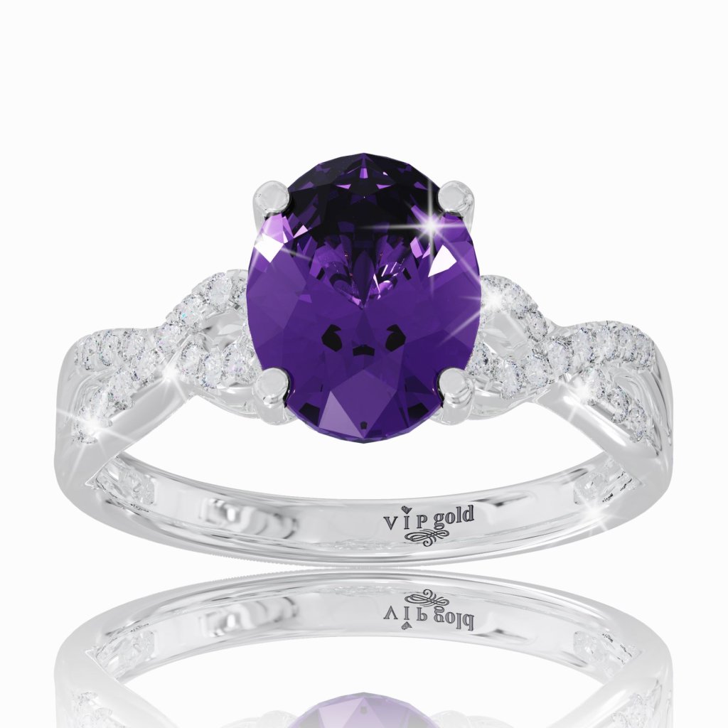 Prsteň zo 14-karátového bieleho zlata s nádherným fialovým ametystom v oválnom výbruse, doplnený žiarivými diamantmi.