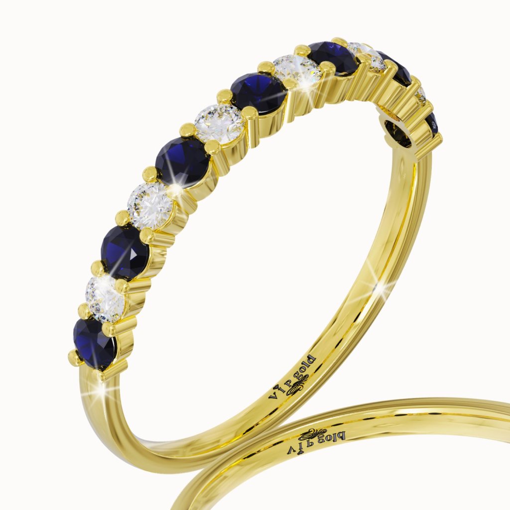 Stredobodom pozornosti tohto zlatého prsteňa je kombinovaný rad modrých zafírov so žiarivými diamantmi.