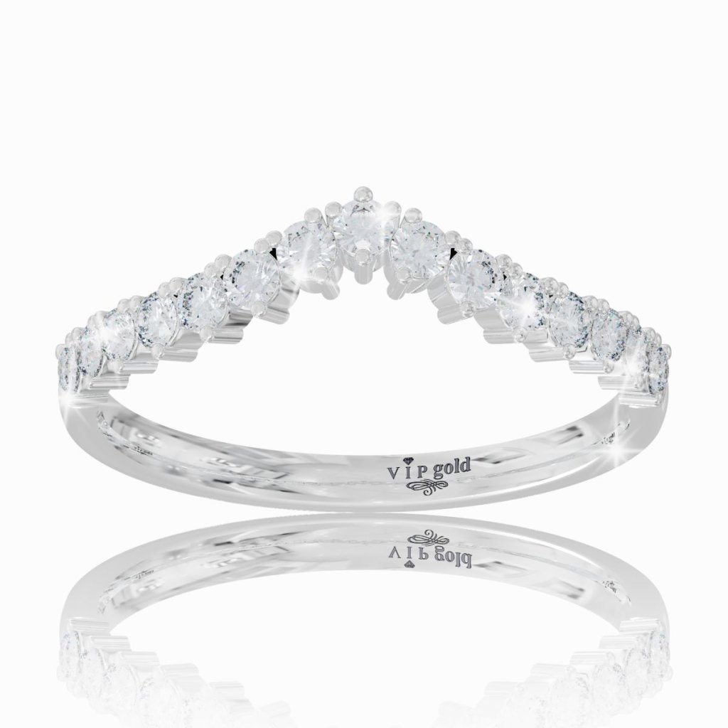 Nádherný jemný prsteň v tvare pomyselnej korunky, vyrobený zo 14 karátového bieleho zlata.