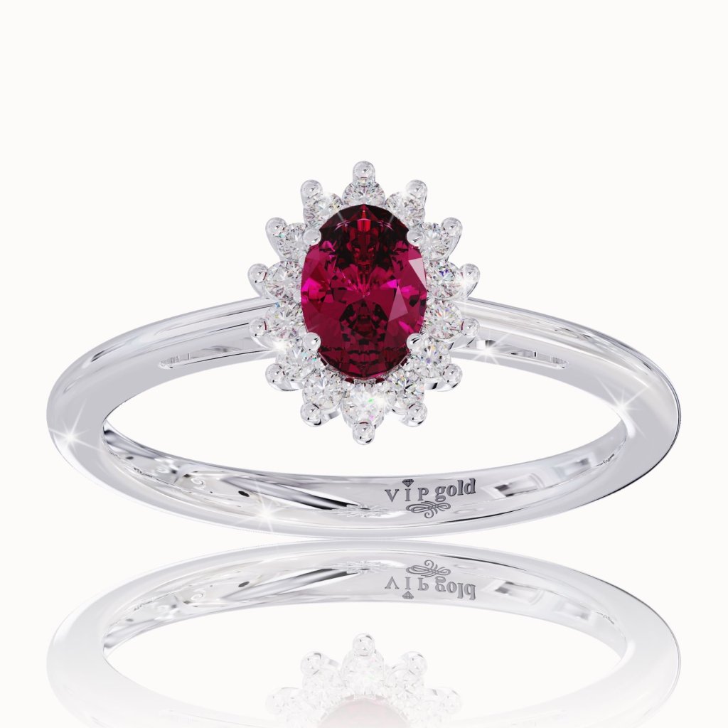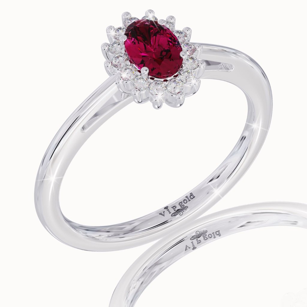 Koruna prsteňa vyzdvihuje nádherný rubín obkolesený diamantmi v briliantovom výbruse.