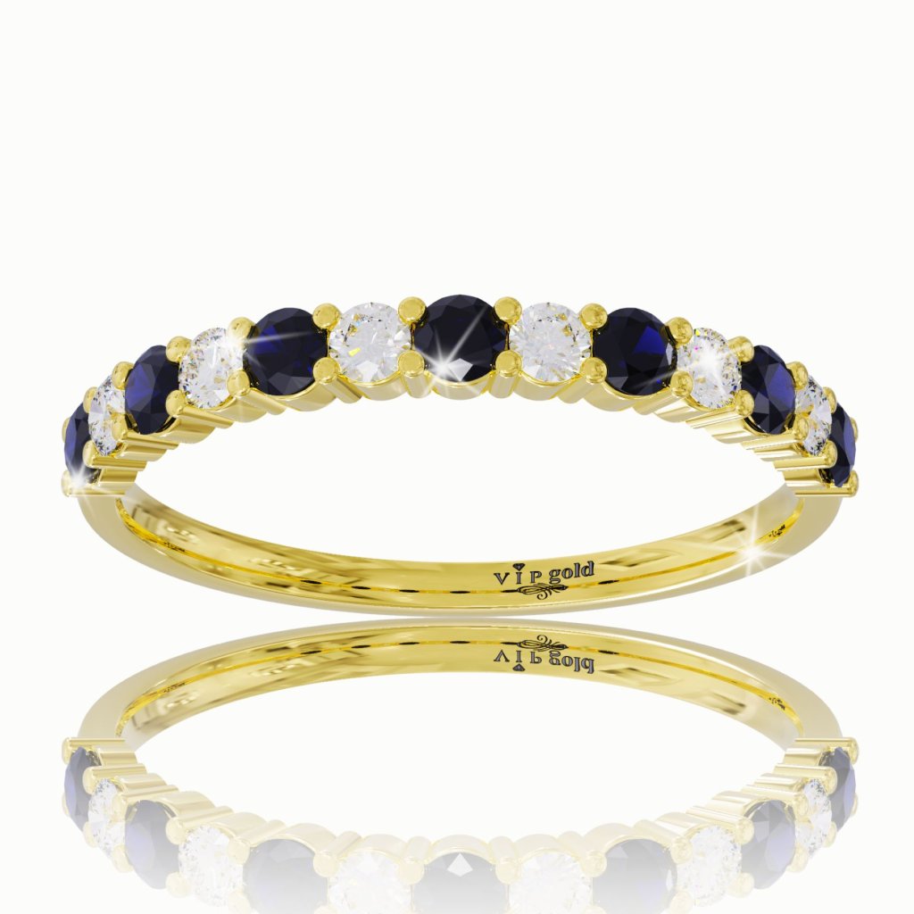 Stredobodom pozornosti tohto zlatého prsteňa je kombinovaný rad modrých zafírov s bielymi zafírmi.