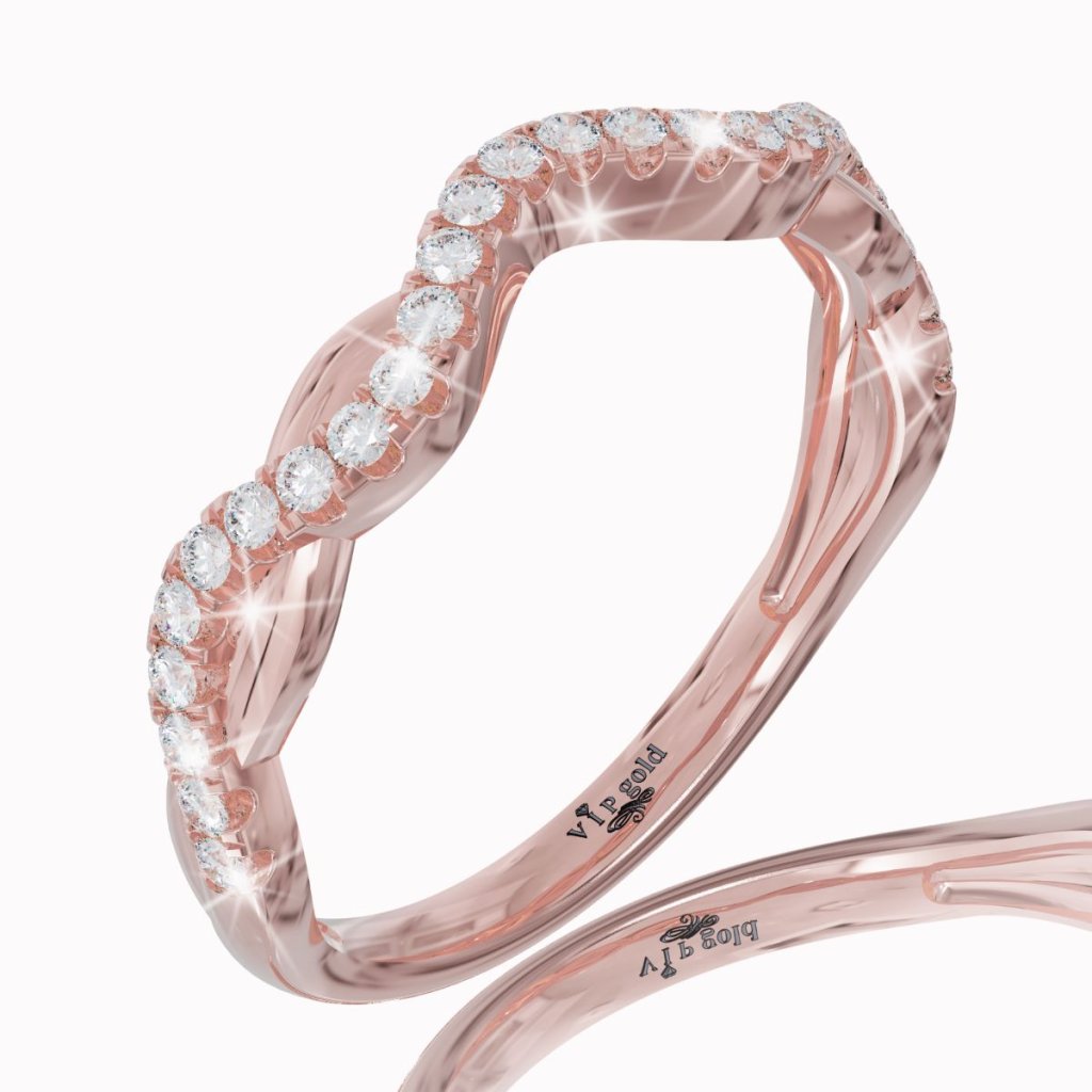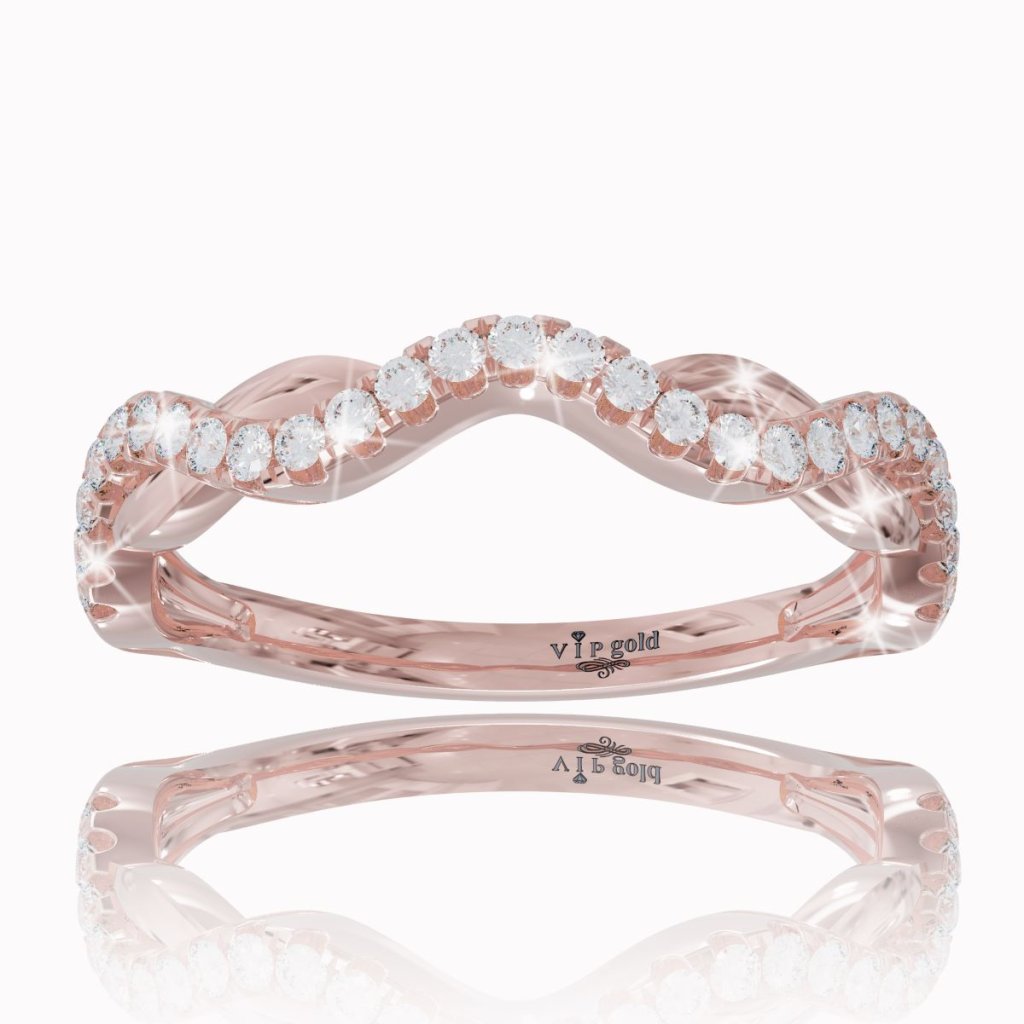Predná polovica prsteňa je zdobená bielymi zafírmi na zvlnenej línii.