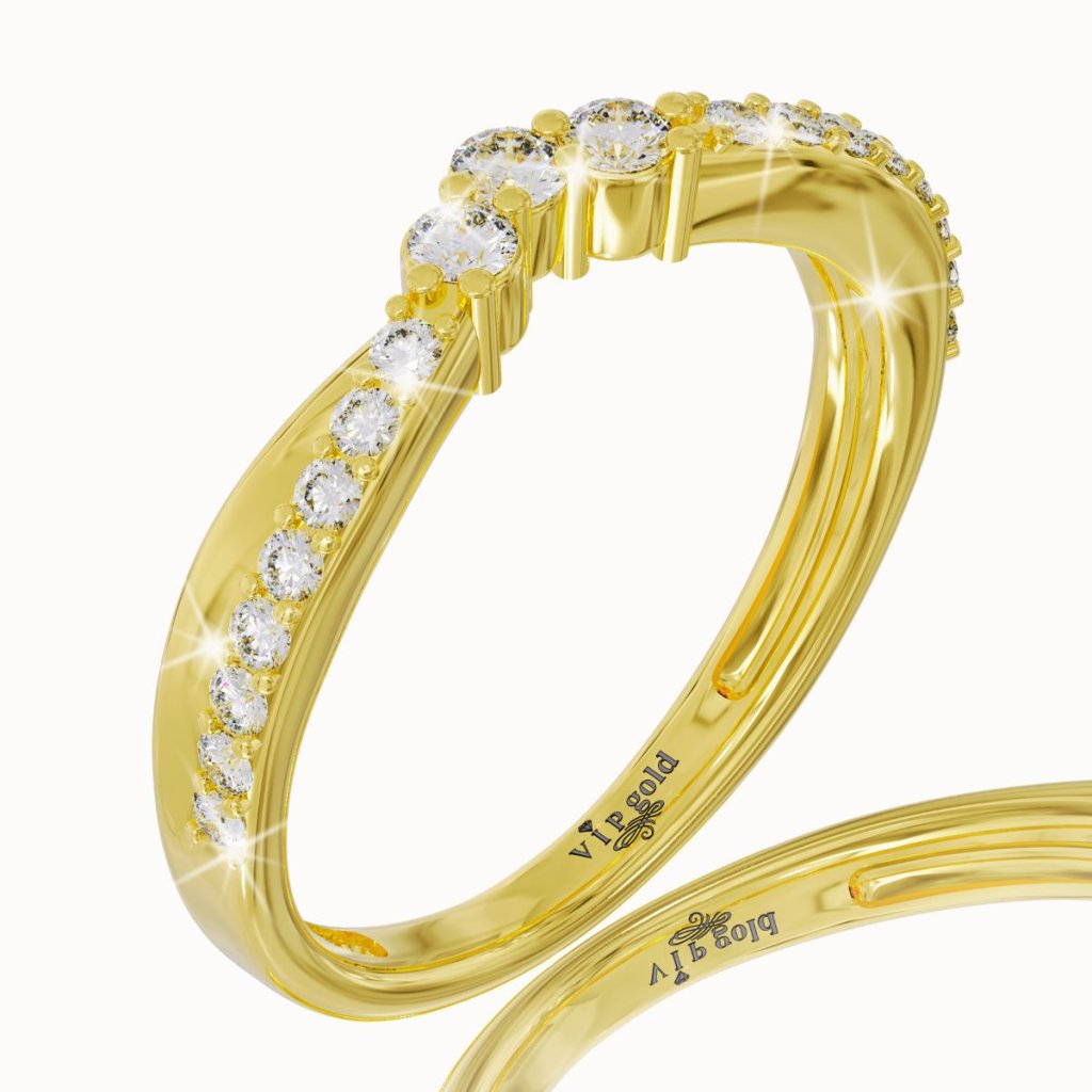 Tento romantický prsteň, vyhotovený zo 14 karátového žltého zlata, ktorý je doplnený žiarivými bielymi zafírmi, je predovšetkým vhodný ako dámska svadobná obrúčka, ale aj ako dar k výročiu, sviatku, alebo len ako prsteň pre potešenie.