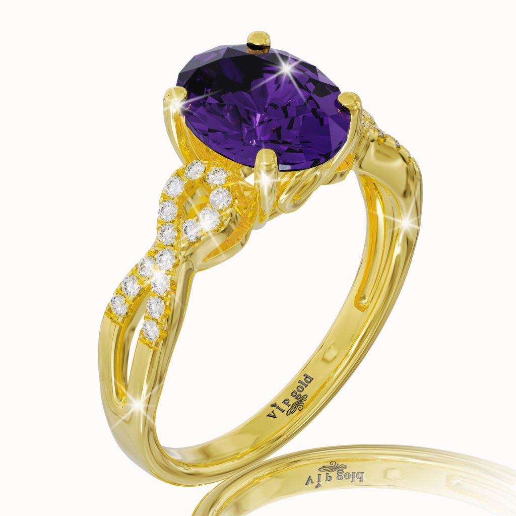 Prsteň zo 14-karátového žltého zlata s nádherným fialovým ametystom v oválnom výbruse, doplnený kameňmi bieleho zafíru.