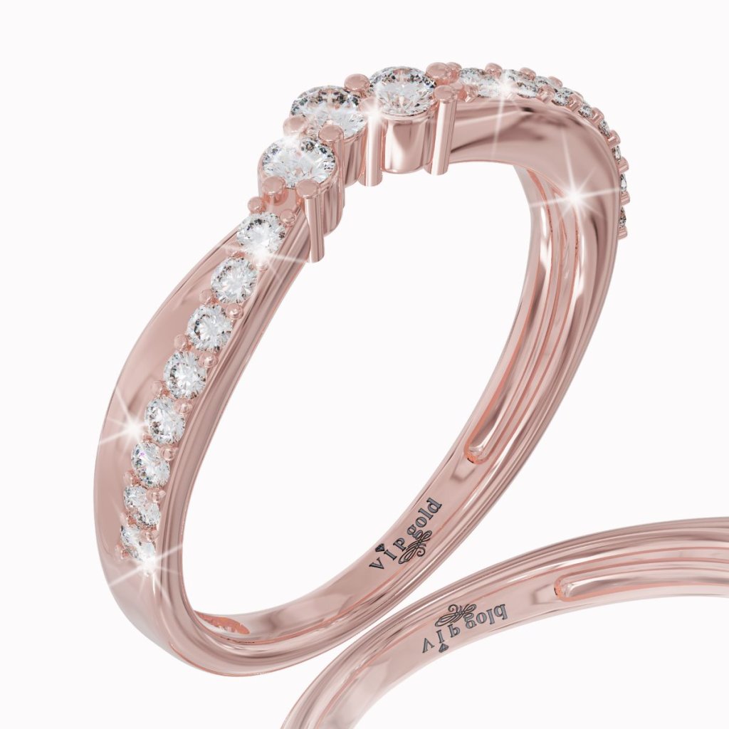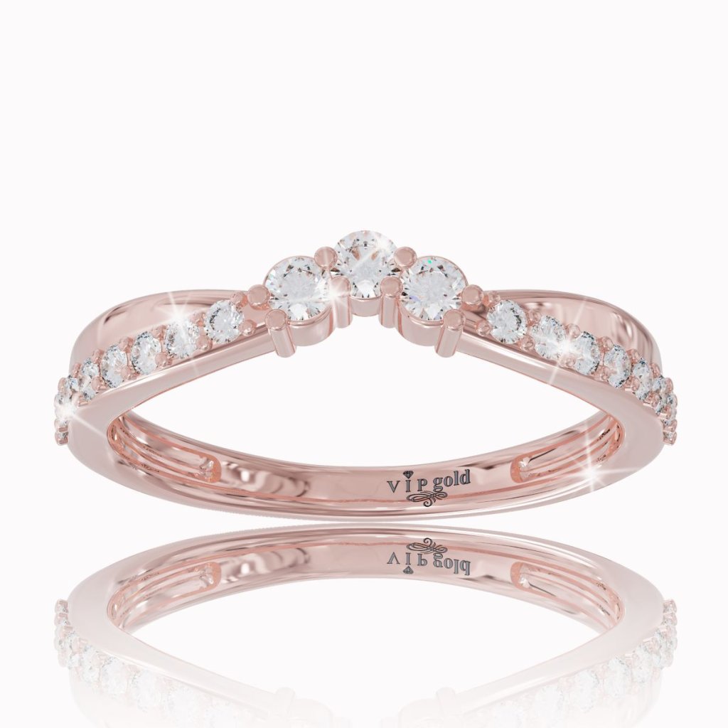 Tento romantický prsteň, vyhotovený zo 14 karátového červeného zlata, ktorý je doplnený žiarivými bielymi zafírmi, je predovšetkým vhodný ako dámska svadobná obrúčka, ale aj ako dar k výročiu, sviatku, alebo len ako prsteň pre potešenie.