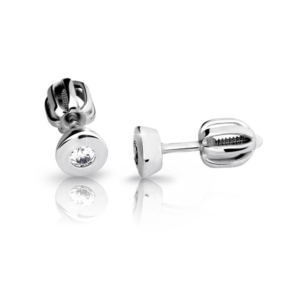 Minimalistické kruhové náušnice, vyrobené zo 14 karátového bieleho zlata, ozdobené žiarivými zirkónmi.