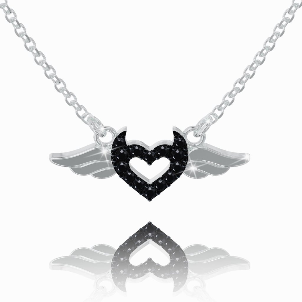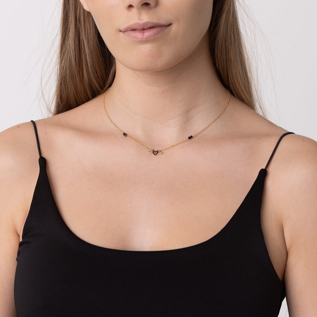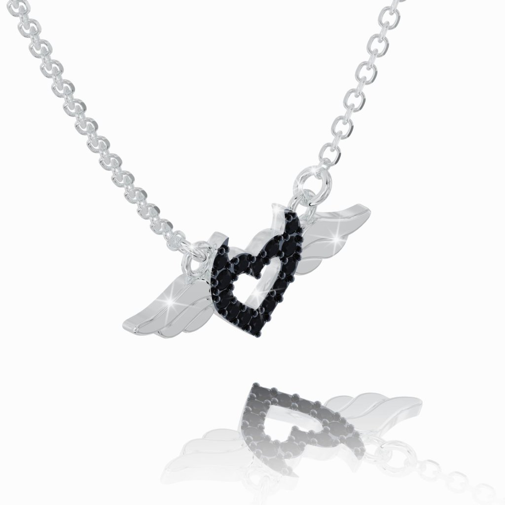 Necklace made of 14 carat white gold with a pendant decorated with black Swarovski zircons and black pearls on the sides of the chain.