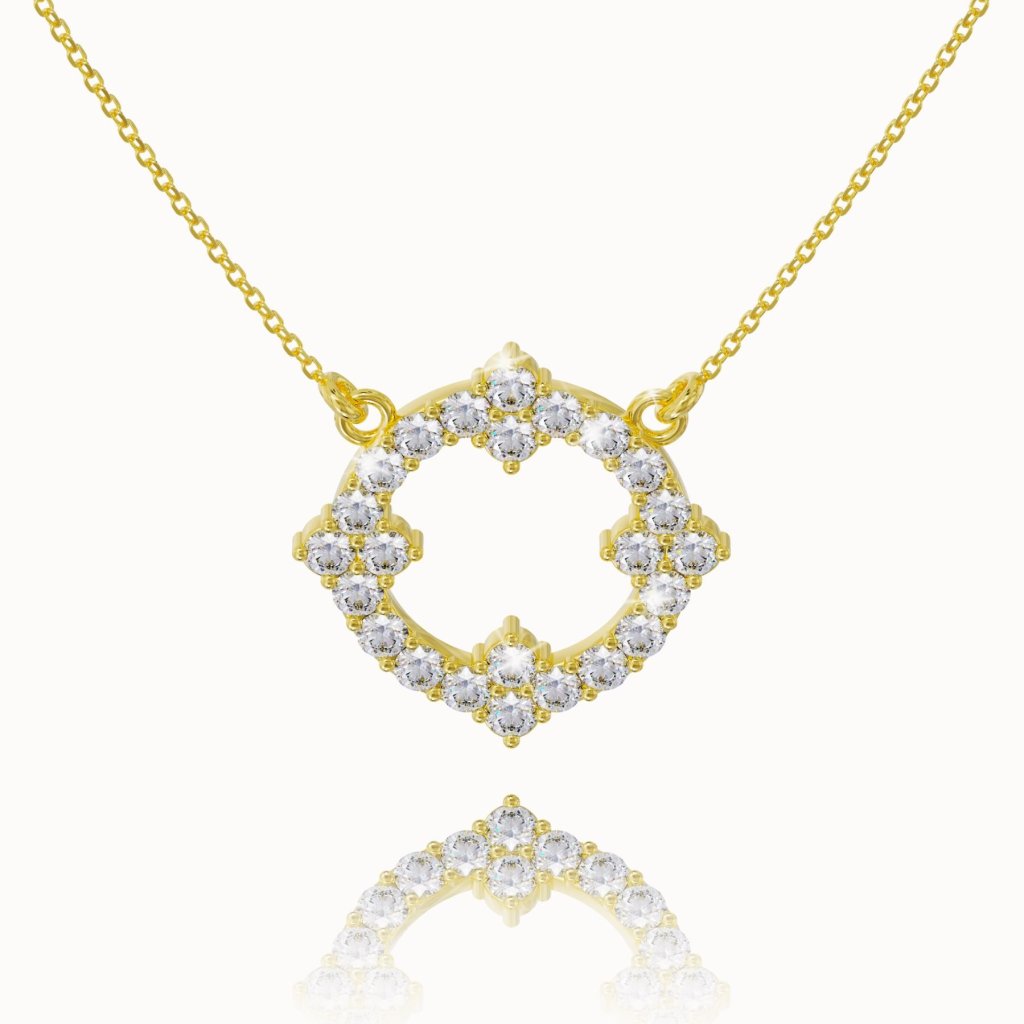 A gold women's necklace with a pendant. The pendant's inner motif resembles a four-leaf clover, which has been a symbol of luck since time immemorial.
