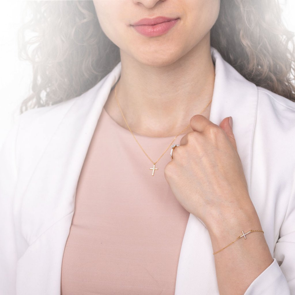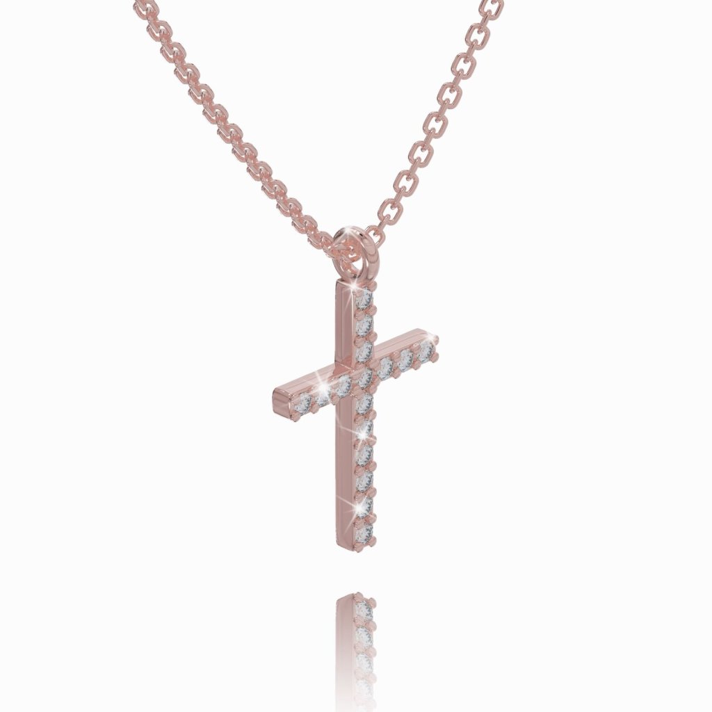 Necklace made of 14 karat rose gold with a cross pendant decorated with clear Swarovski zircons.