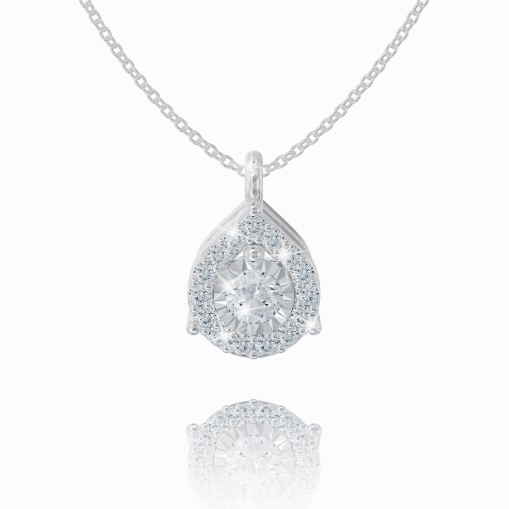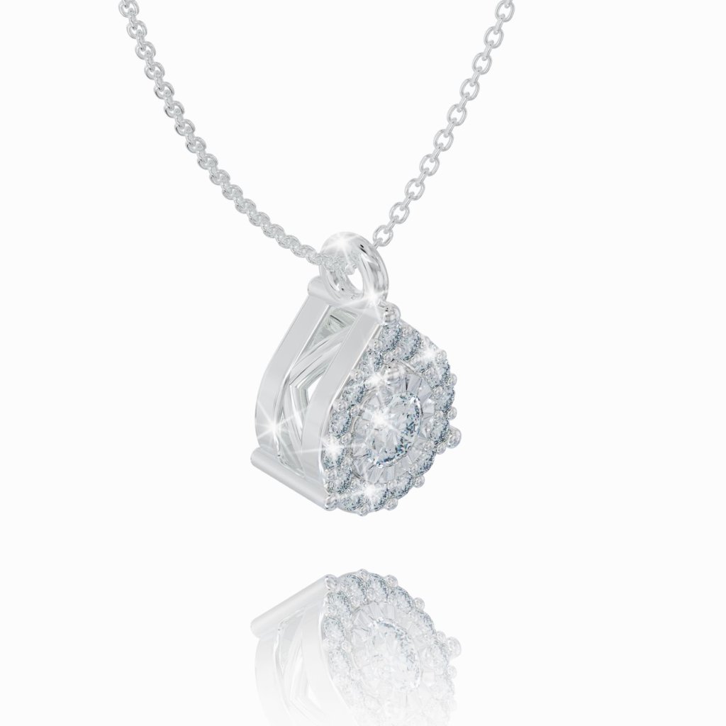 A delicate necklace made of 14 karat white gold that will gently illuminate your cleavage thanks to the luxurious diamonds set in the pendant.