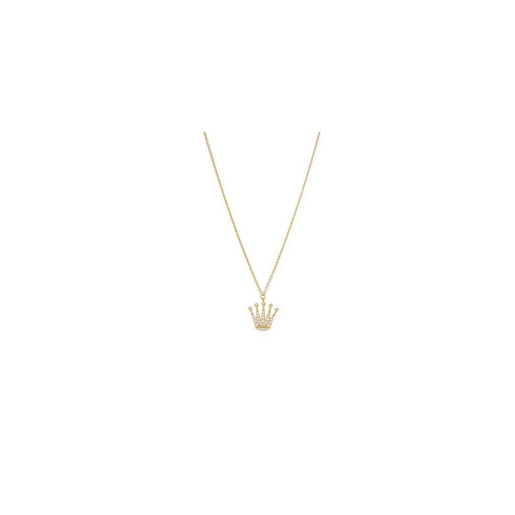 A necklace made of 14-carat yellow gold with a crown-shaped pendant set with clear Swarovski zircons.