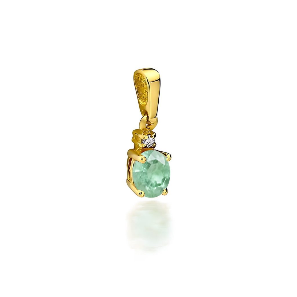 Elegantný prívesok s diamantom a smaragdom, vyrobený zo 14 karátového žltého zlata.