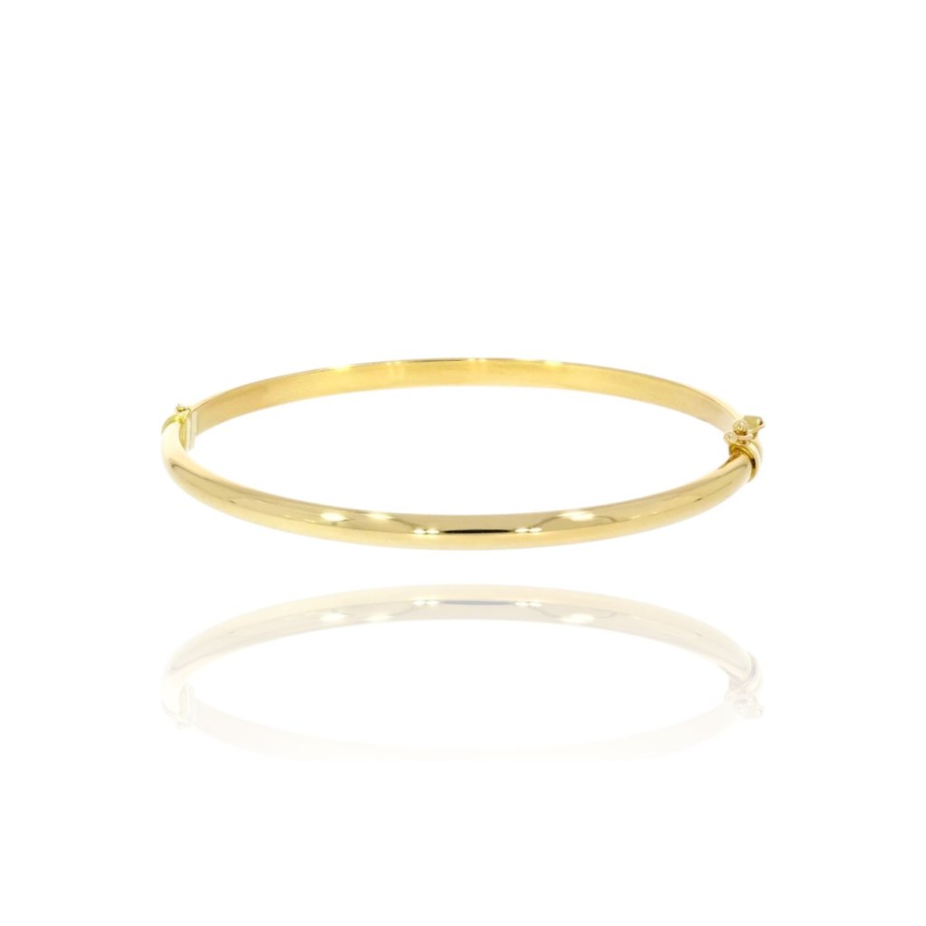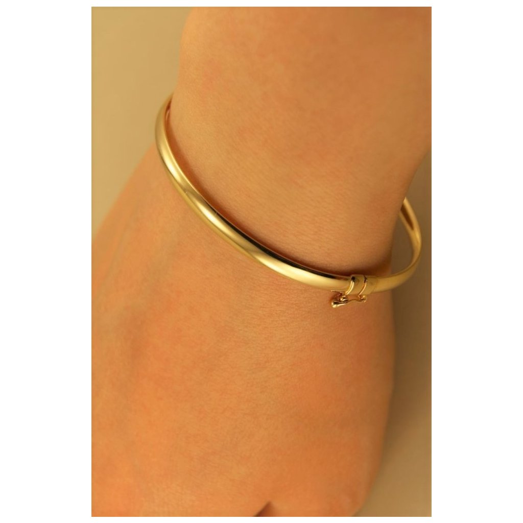 Zlatý dámsky obručový náramok vyrobený zo žltého 14 karátového zlata má po celom obvode hladkú, lesklú povrchovú úpravu.