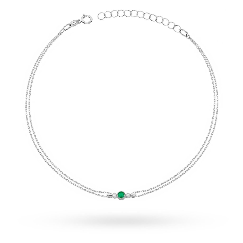 Minimalistický dámsky náramok, ktorý je vyhotovený z bieleho 14 karátového bieleho zlata, zdobený diamantmi a smaragdom.