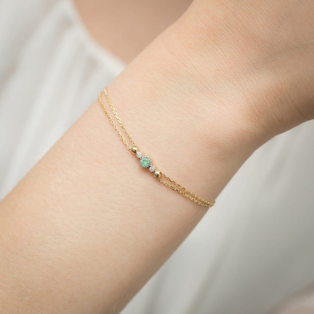 Minimalistický dámsky náramok, ktorý je vyhotovený zo žltého 14 karátového žltého zlata, zdobený diamantmi a smaragdom.