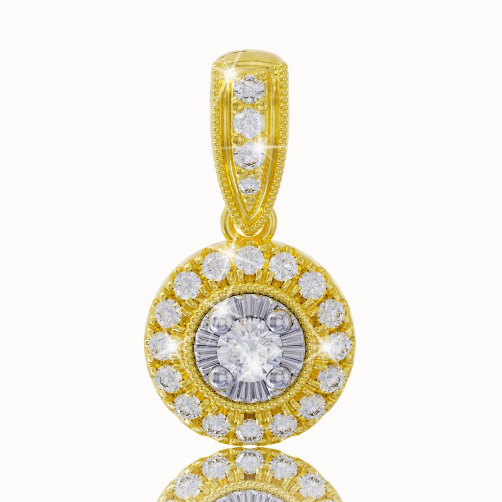 Očarujúci prívesok zo 14 karátového žltého zlata, vykladaný žiarivými diamantmi, je vhodným šperkom na doplnenie každého outfitu.