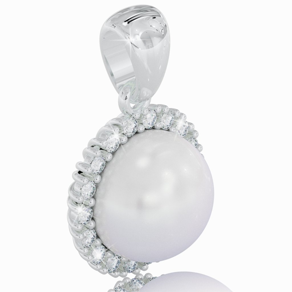 Prvý pohľad upriami pútavá biela perla, ktorá je centralizovaná v prívesku z bieleho 14 karátového zlata.
