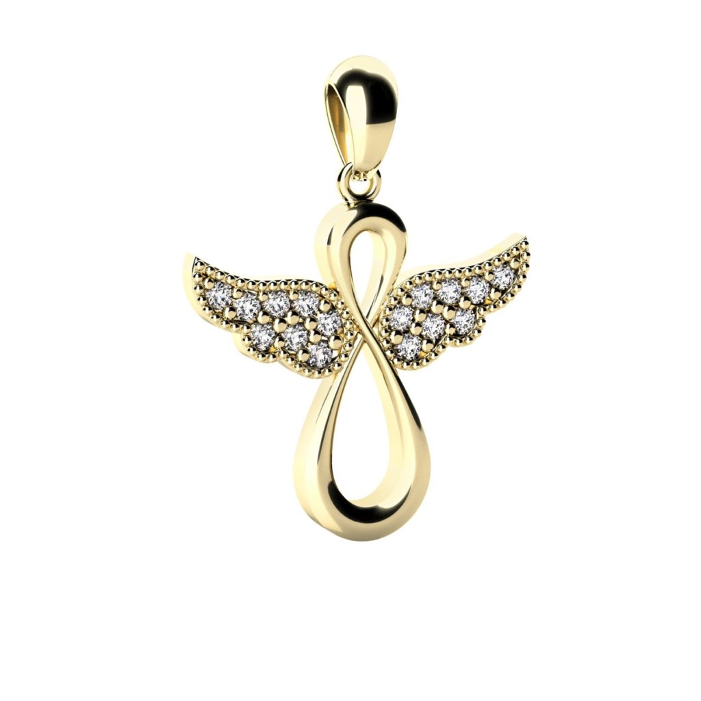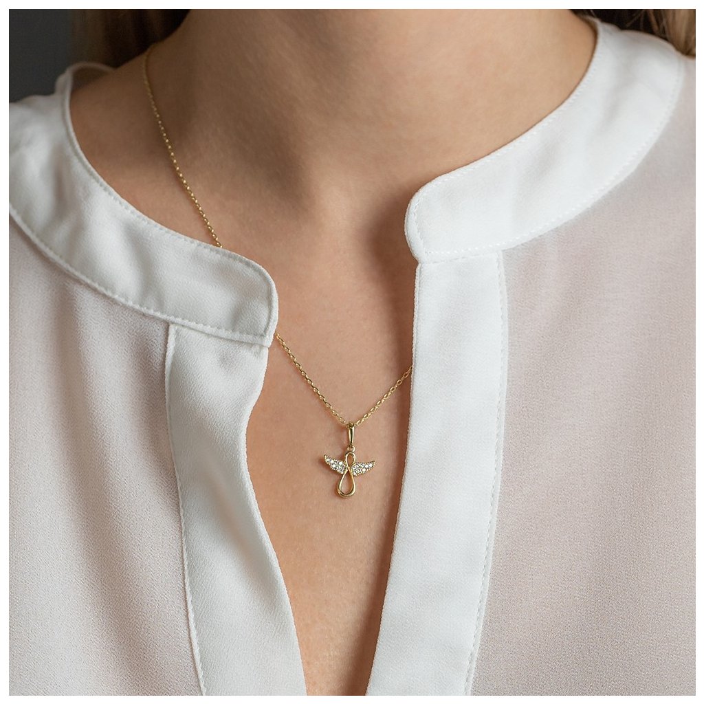 Roztomilý prívesok v tvare jemného anjelika v 14 karátovom žltom zlate rozjasní Váš deň nech ste kdekoľvek.