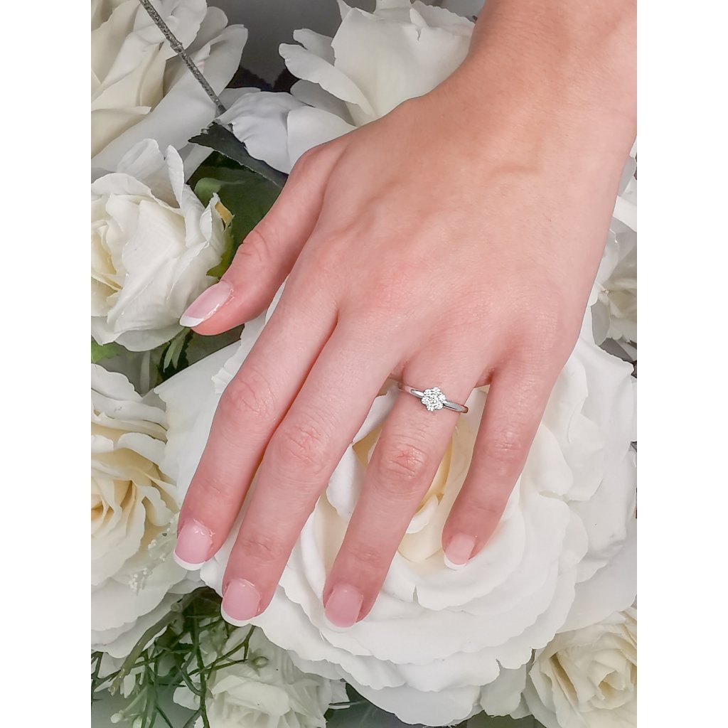 Pýchou prsteňa je diamantová koruna v dokonalom výbruse briliantu, ktorá vďaka osadeniu briliantov pripomína jemný kvet.