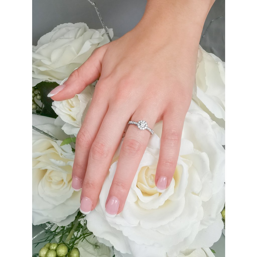 V prsteni sú osadené honosné diamanty v celkovej hmotnosti 0,67 ct v čistote SI a farbe H, resp. čistote VVS a farbe F pri lab. diamantoch.