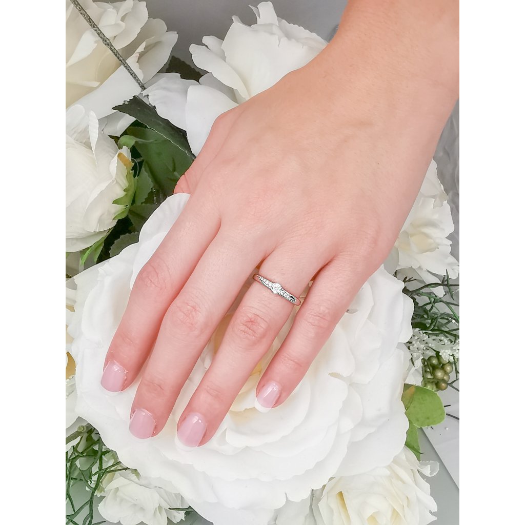 Tento prsteň zo 14-karátového bieleho zlata zdobený diamantmi v briliantovom výbruse, je prvotriednym zlatníckym dielom s dokonale prepracovaným dizajnom.